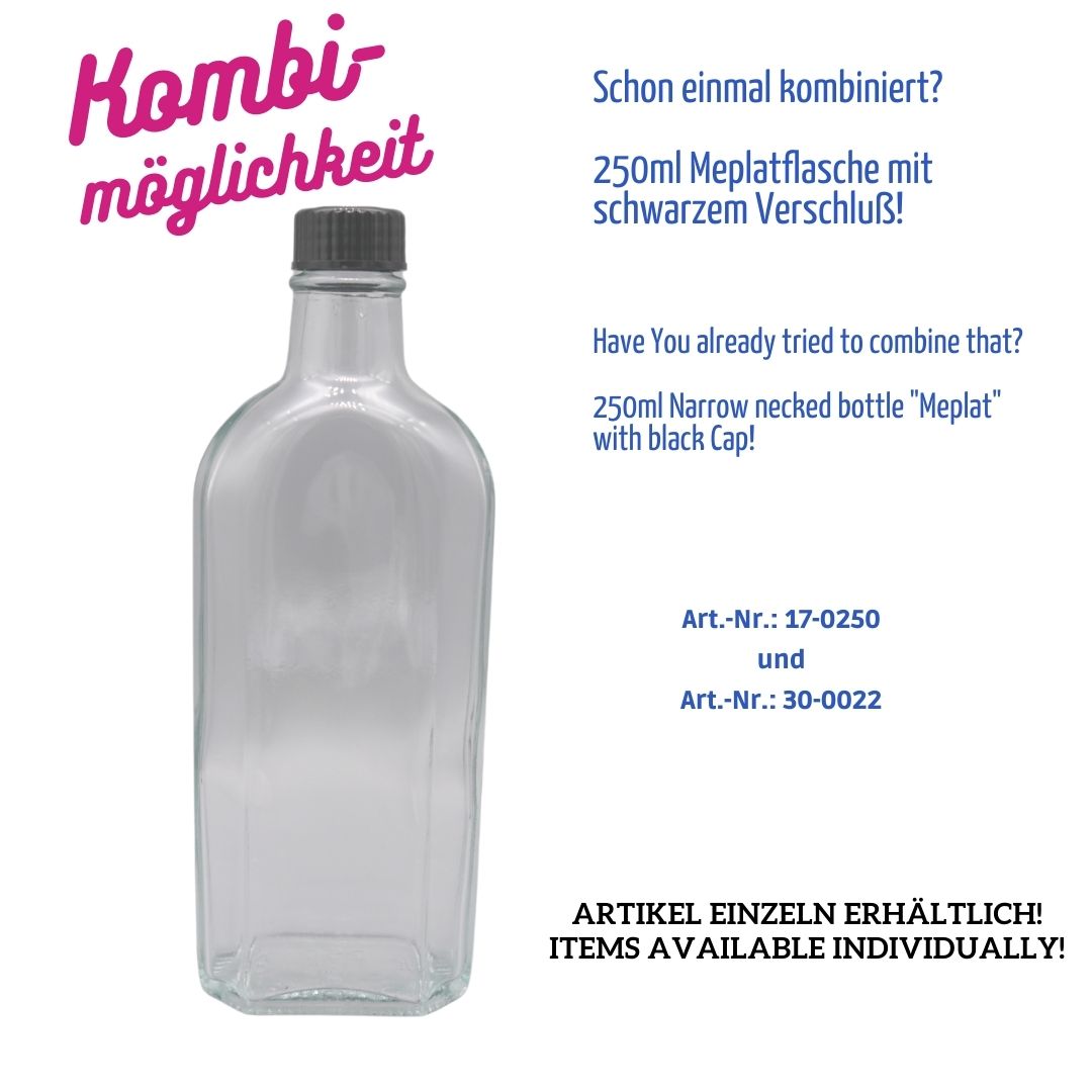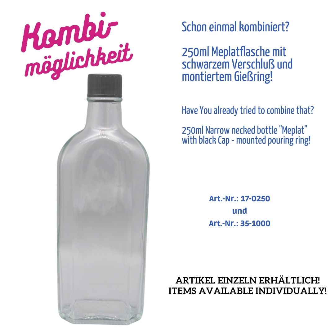 Stilvolle Meplat-Enghalsflasche mit 250 ml Fassungsvermögen aus klarem Glas und genormtem DIN22-Gewinde. Durch ihre flach-eckige Form wirkt die Flasche besonders edel und liegt gut in der Hand – ideal für dekorative wie funktionale Anwendungen.