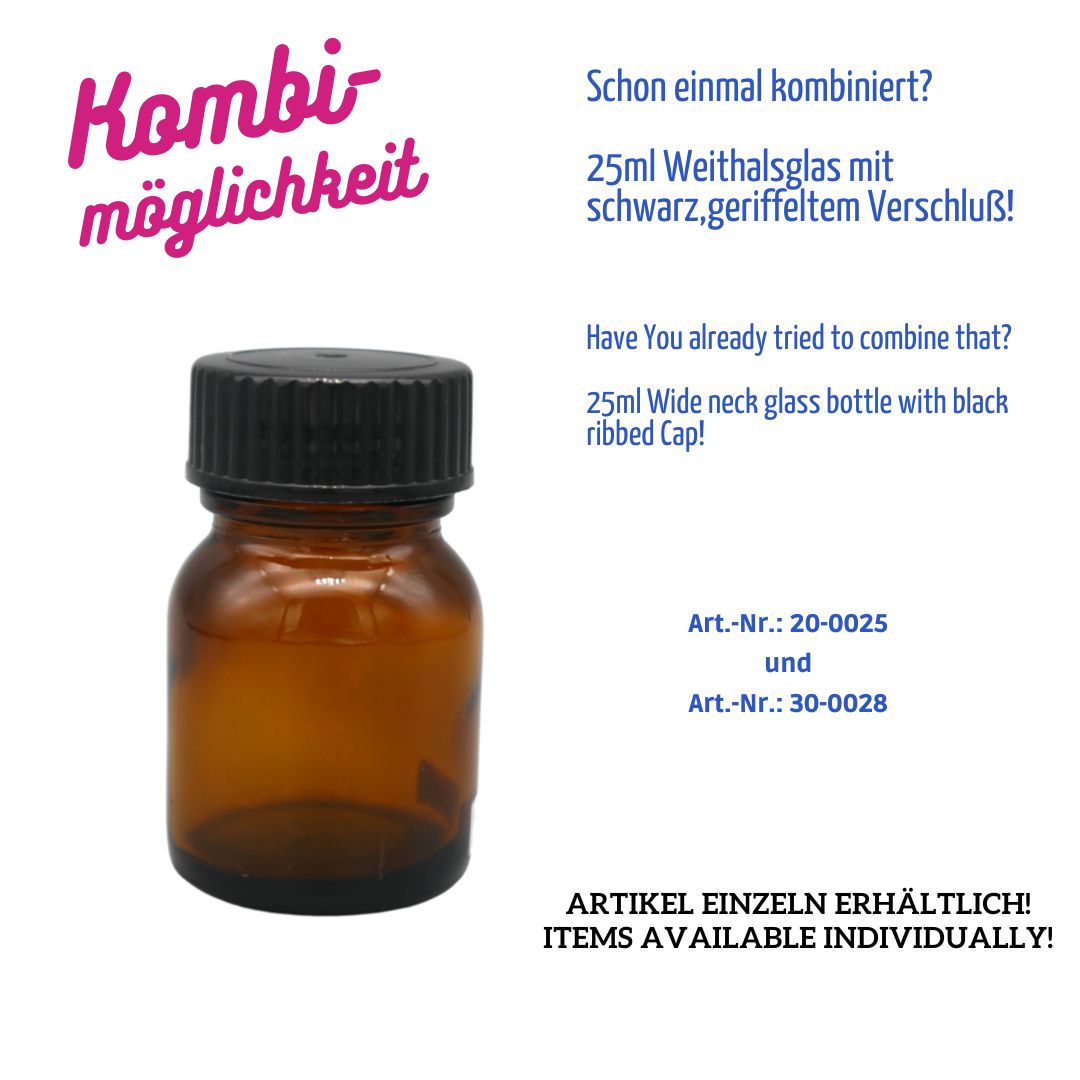 Praktische Weithalsflasche aus braunem Glas mit einem Volumen von 25 ml und genormtem DIN28-Gewinde. Die runde Form und die große Öffnung ermöglichen ein einfaches Befüllen und Entnehmen – ideal für feste und halbfeste Produkte.