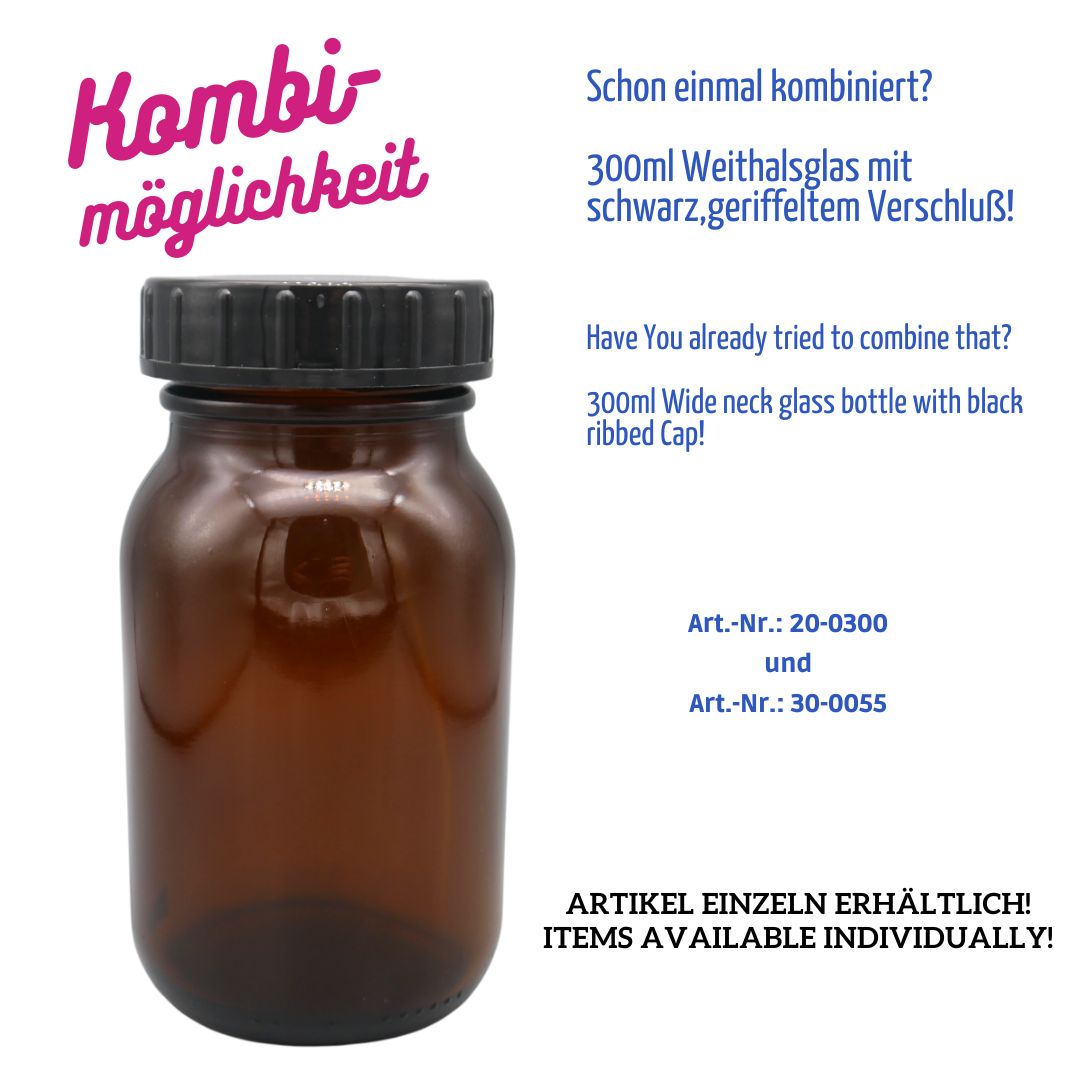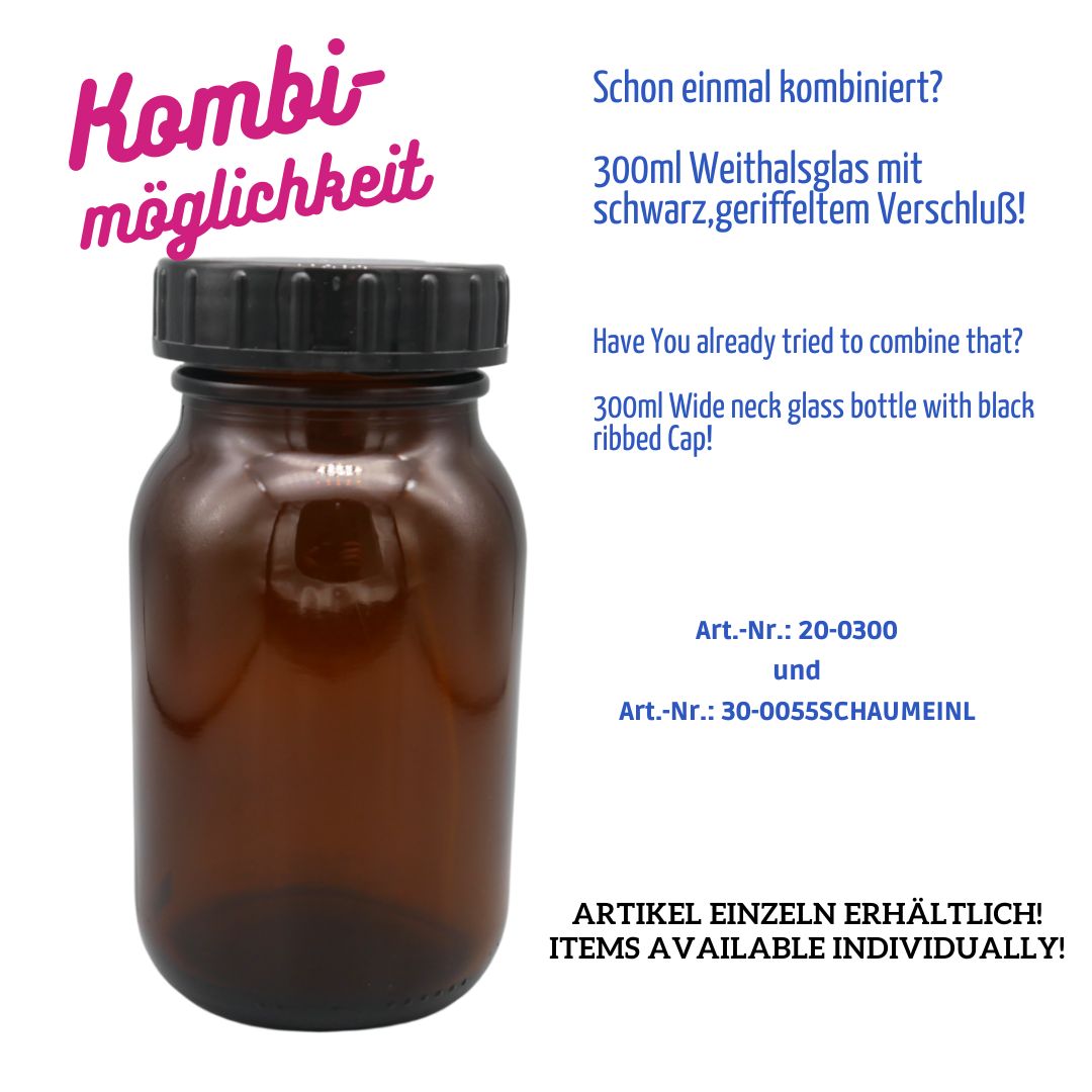 Praktische Weithalsflasche aus braunem Glas mit einem Volumen von 300 ml und genormtem DIN55-Gewinde. Die runde Form und die große Öffnung ermöglichen ein einfaches Befüllen und Entnehmen – ideal für feste und halbfeste Produkte.