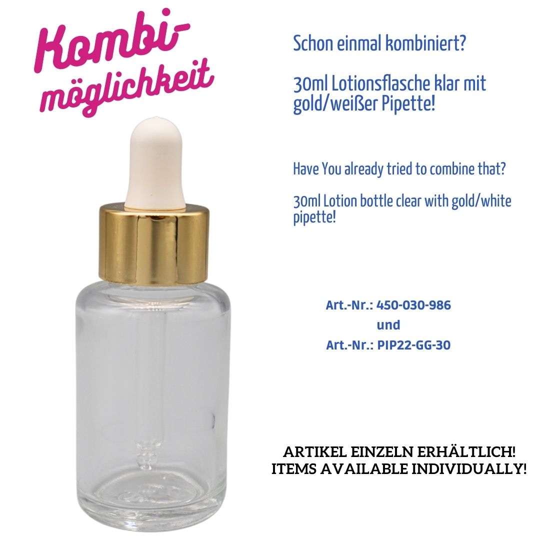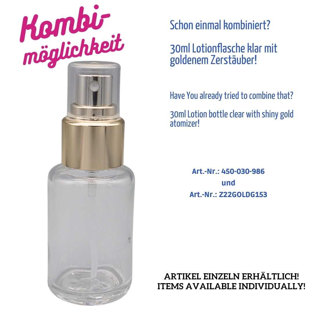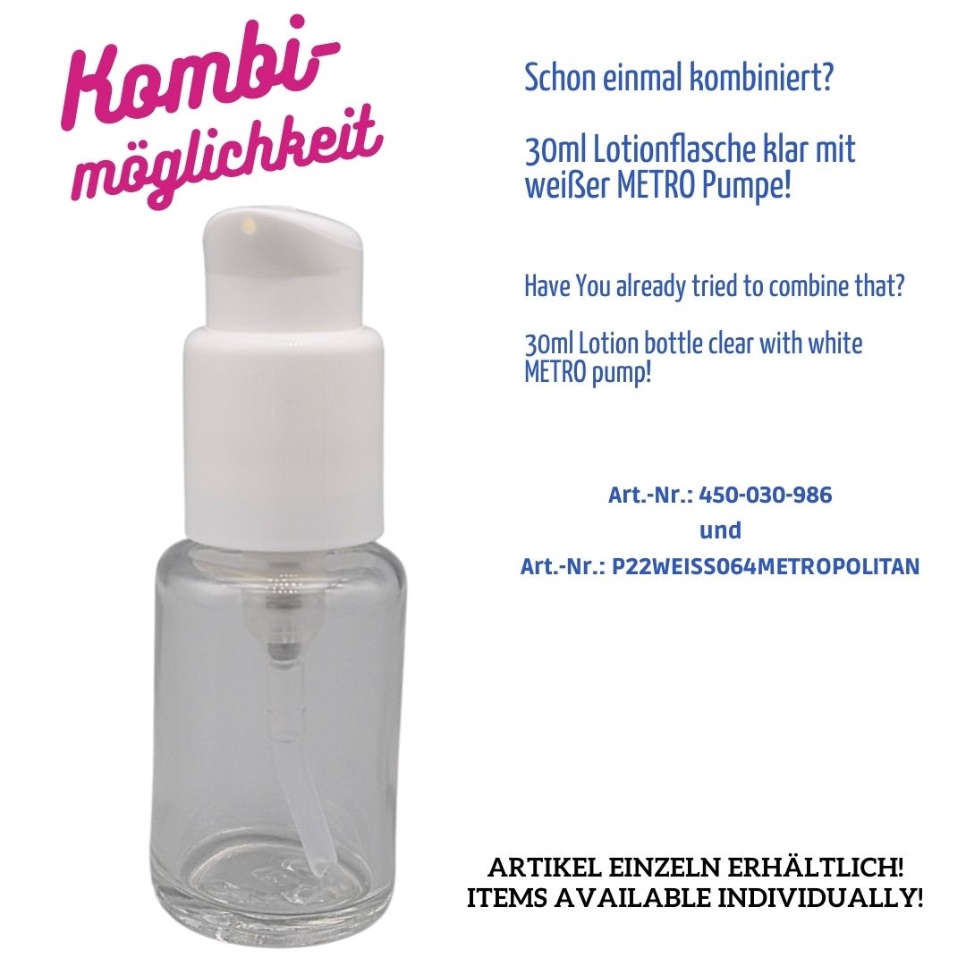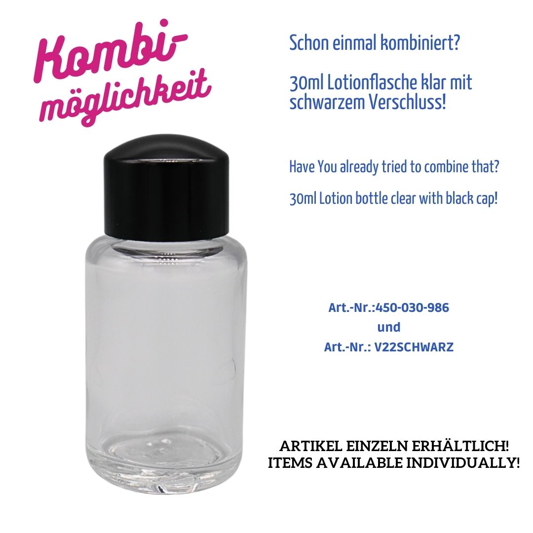 30ml – Lotionsflasche Luna – F986 – Klarglas – rund – abgerundete Schulter – Gewinde: 22/410 GCMI – AQL-Werte 0,01/0,65/1,5/6,5 – QKL 4