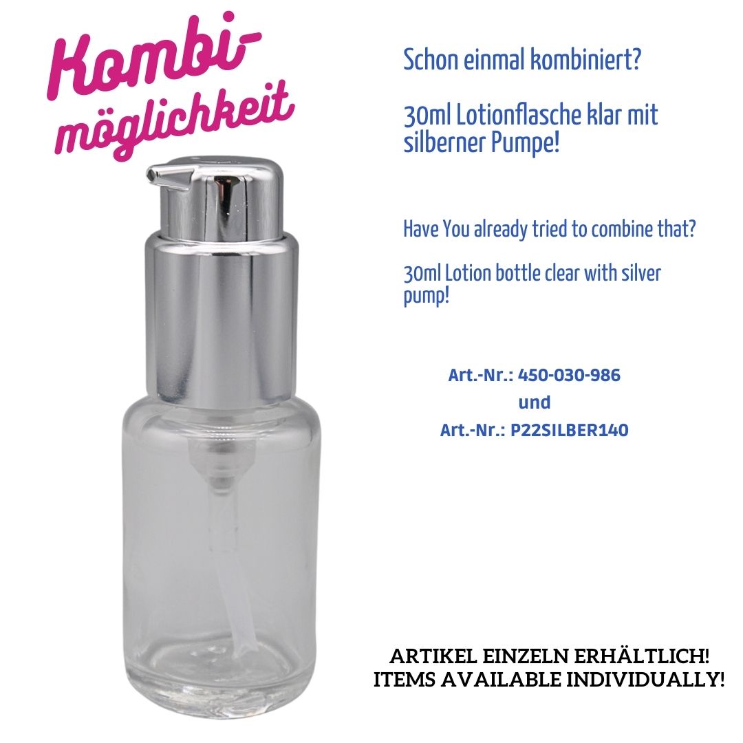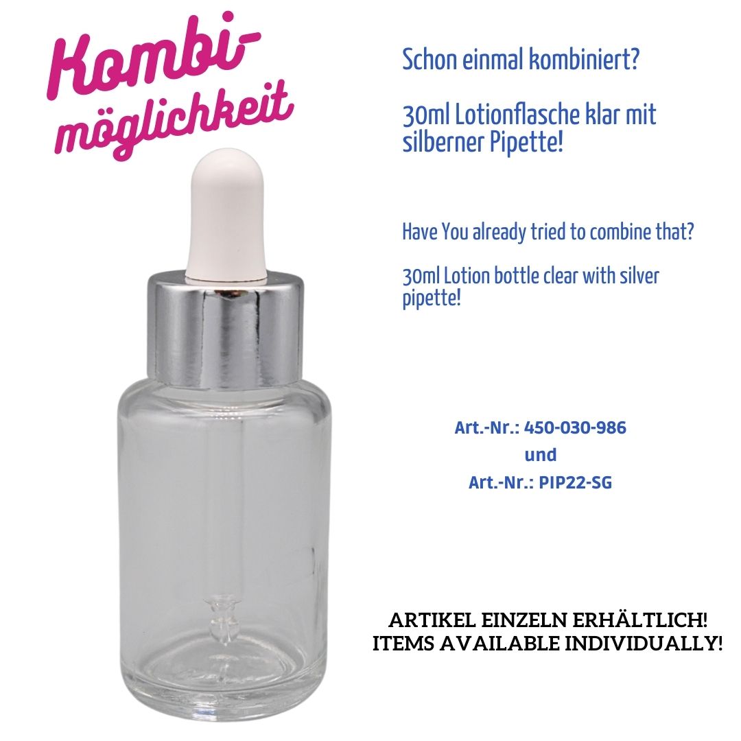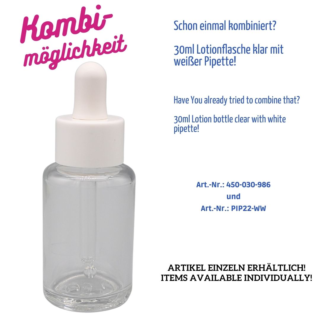 30ml – Lotionsflasche Luna – F986 – Klarglas – rund – abgerundete Schulter – Gewinde: 22/410 GCMI – AQL-Werte 0,01/0,65/1,5/6,5 – QKL 4