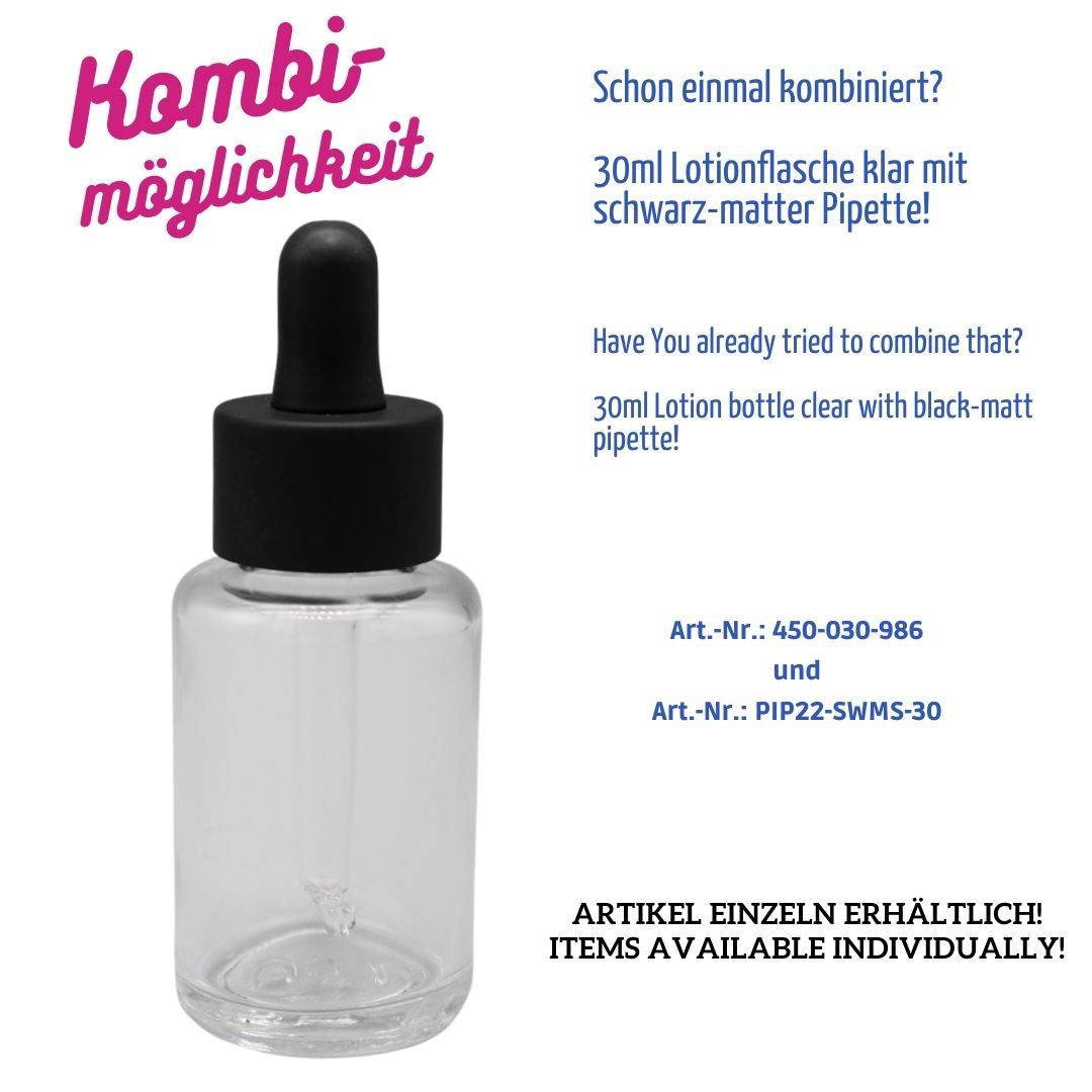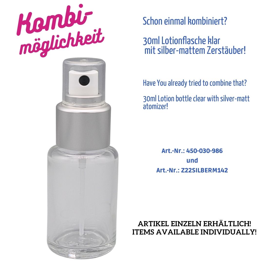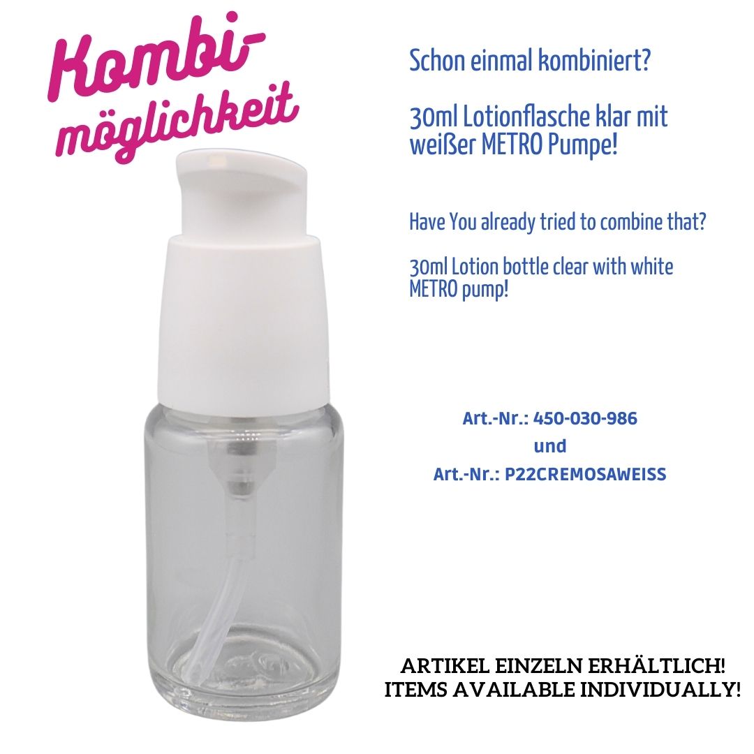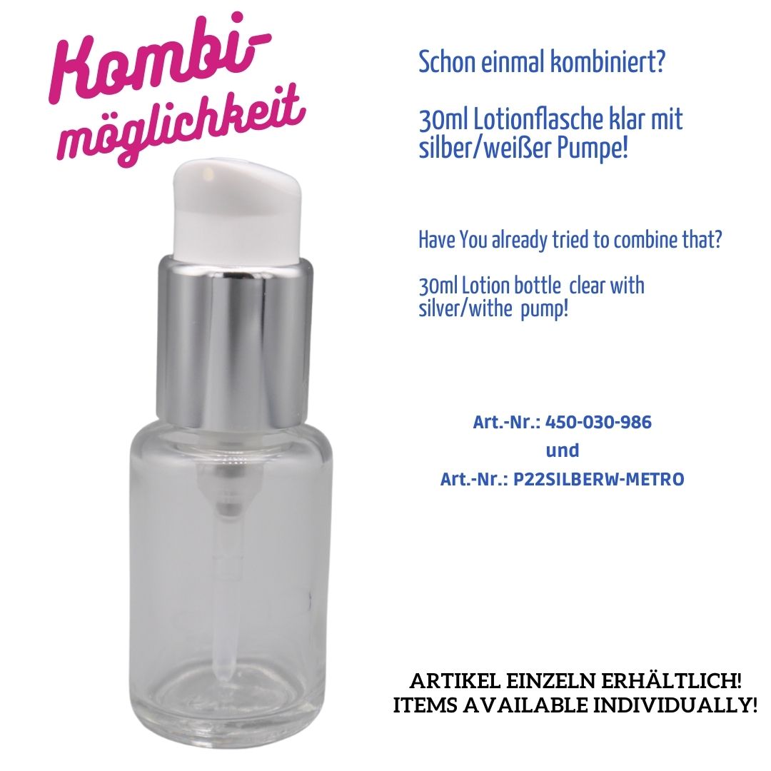 30ml – Lotionsflasche Luna – F986 – Klarglas – rund – abgerundete Schulter – Gewinde: 22/410 GCMI – AQL-Werte 0,01/0,65/1,5/6,5 – QKL 4