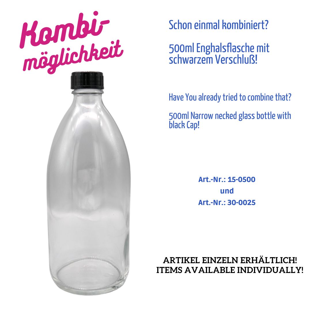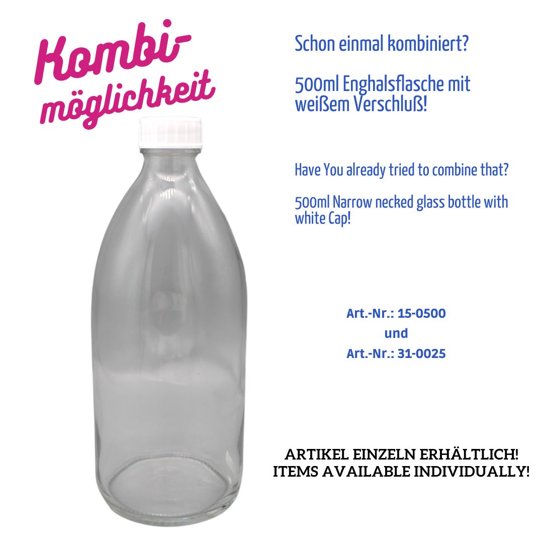 Vielseitig einsetzbare Enghalsflasche aus klarem Glas mit einem Fassungsvermögen von 500 ml und genormtem DIN25-Gewinde.