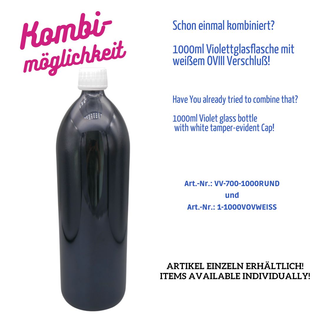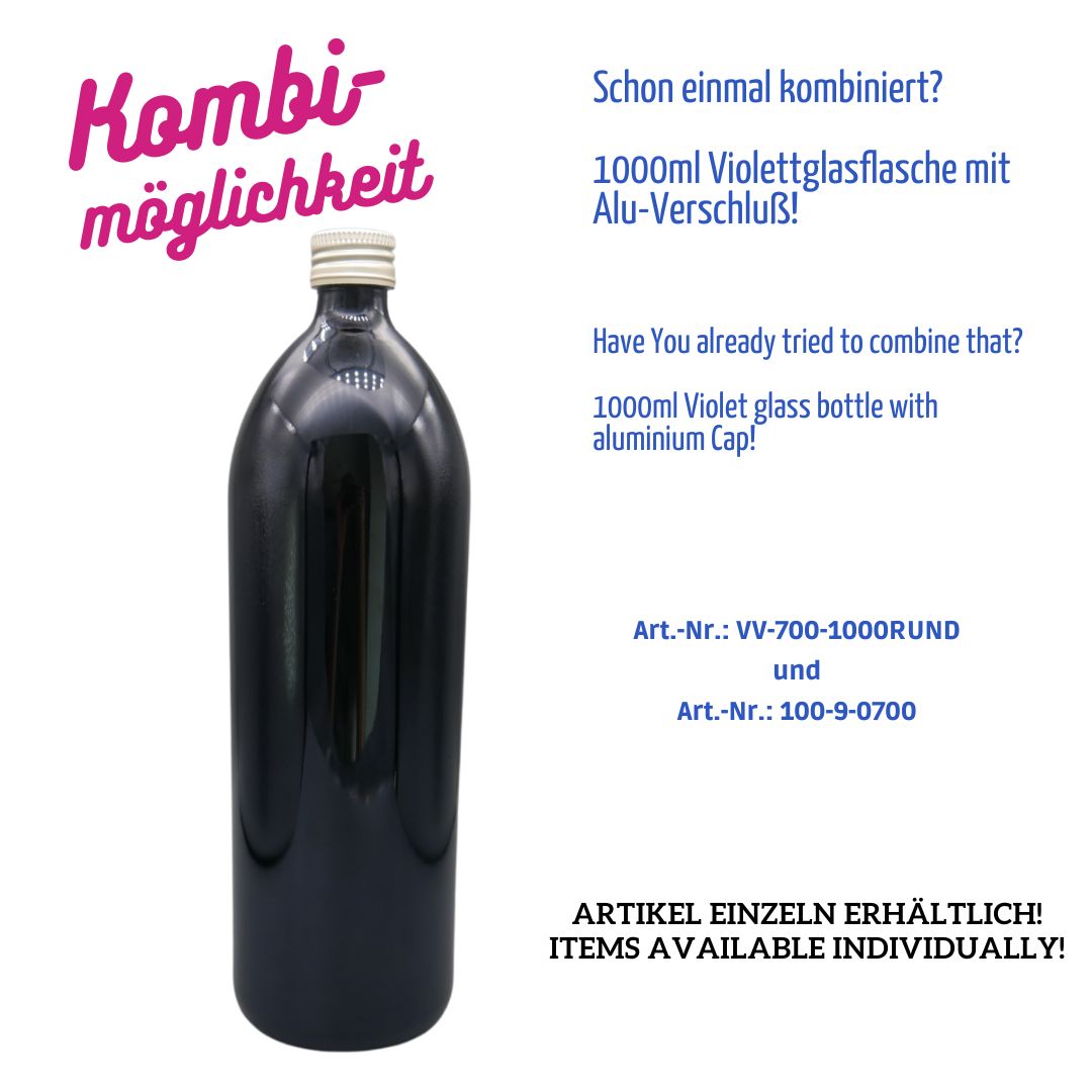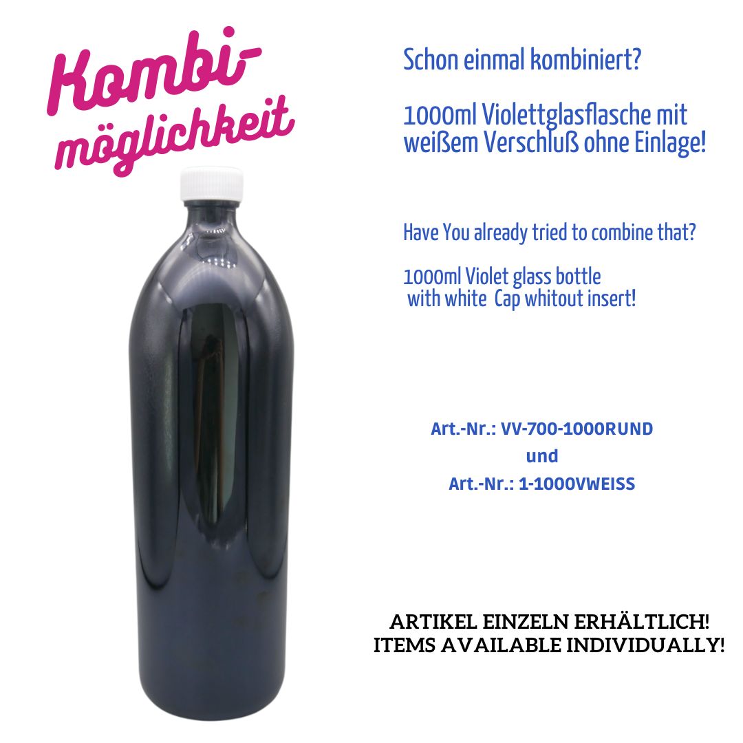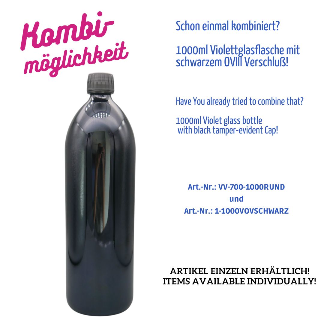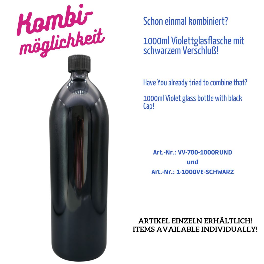Diese 1000 ml Rundflasche besticht durch ihr hochwertiges Design und optimale Funktionalität für lichtempfindliche Produkte. Die schwarzviolette Farbe garantiert absoluten Lichtschutz und bewahrt die Qualität lichtempfindlicher Substanzen effektiv.